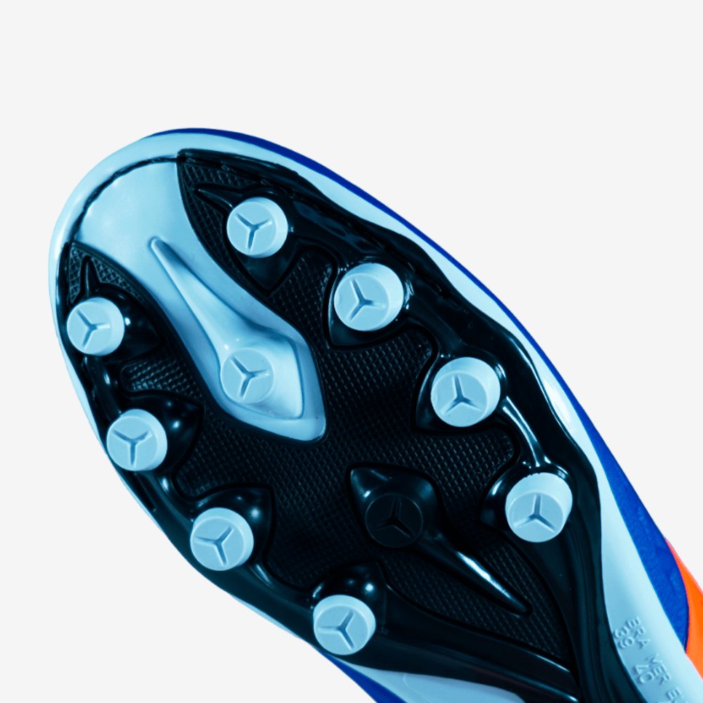 • Tração Precisa: A sola com pinos possui um design que proporciona uma aderência excepcional em superfícies de grama, garantindo estabilidade em cada movimento e drible.